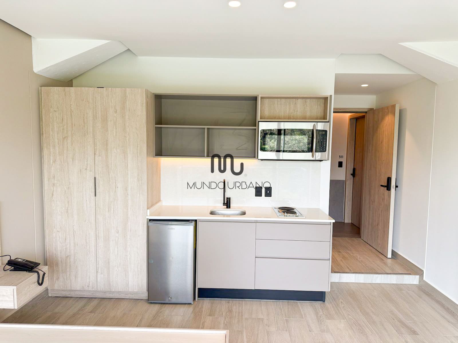 • Cocineta equipada con estufa eléctrica, refrigerador y microondas