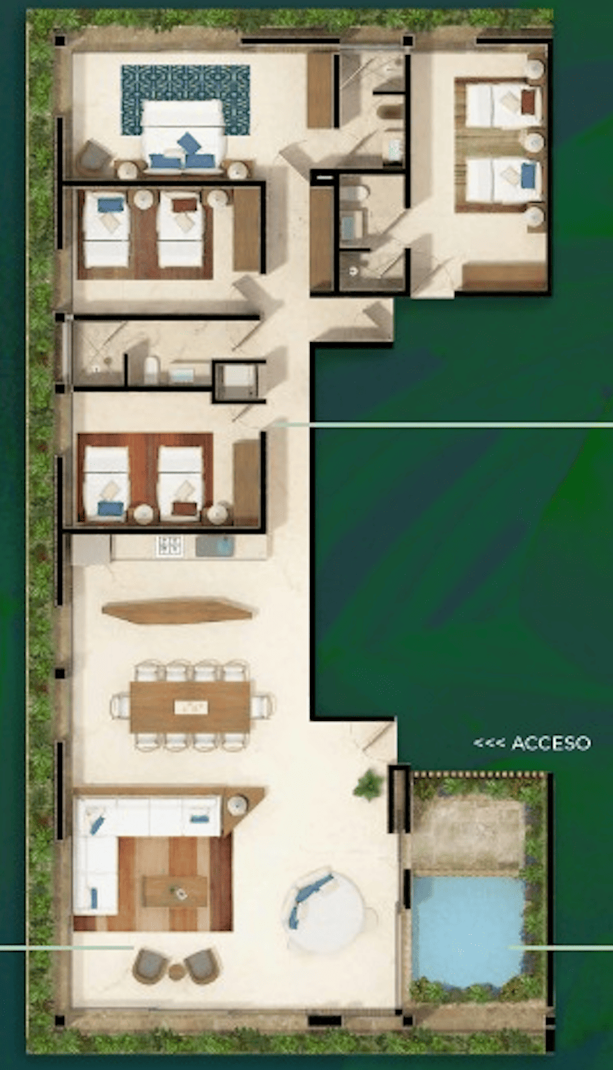 • Amplia sala y comedor con ventanales de piso a techo que se abren hacia una terraza privada con alberca y jardín rodeado de vegetación tropical, creando un ambiente sereno y natural.