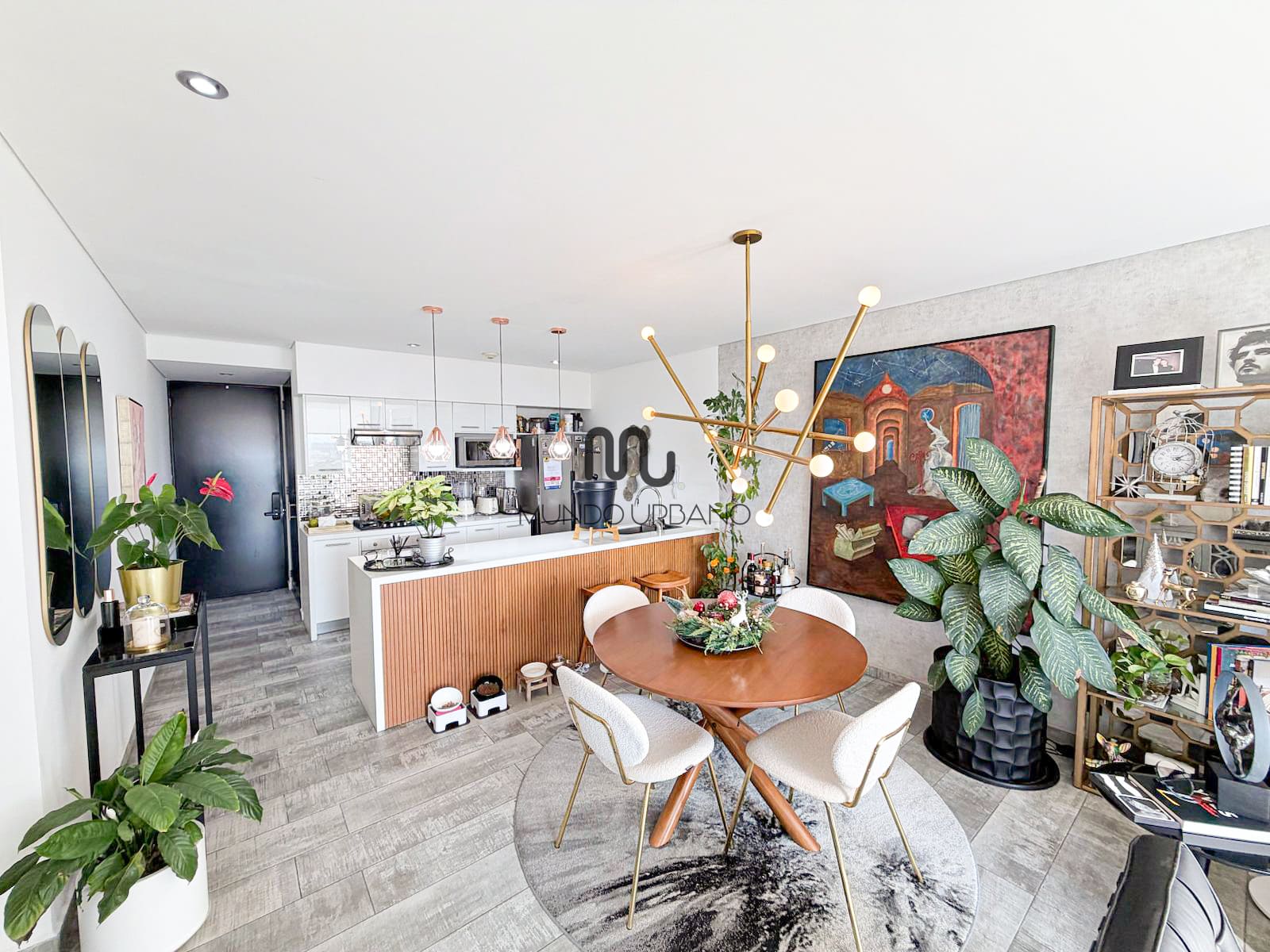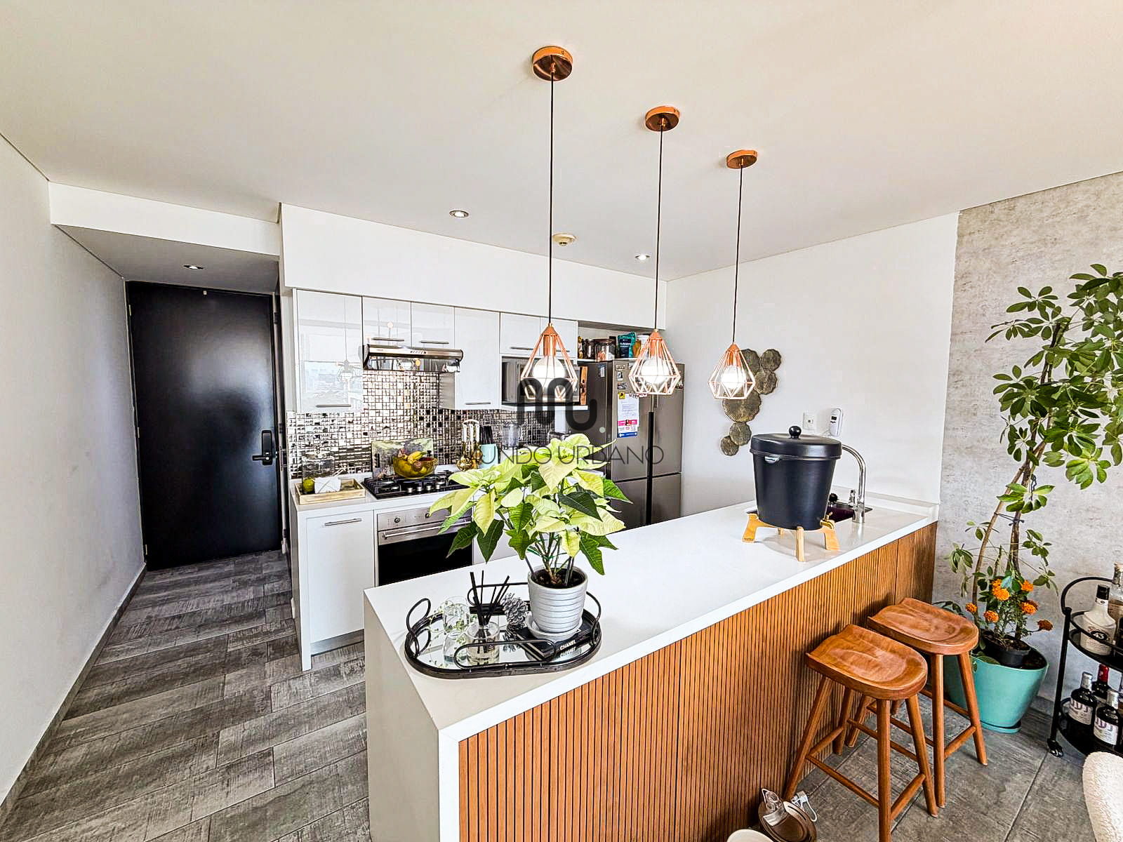 • Cocina abierta con barra de cuarzo y carpintería en madera
